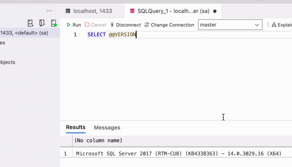 You'll see the output on the screen. This is the result of the query on the SQL Server Database inside the container. It shows SQL Server 2017 which is the version we chose on Docker Hub.