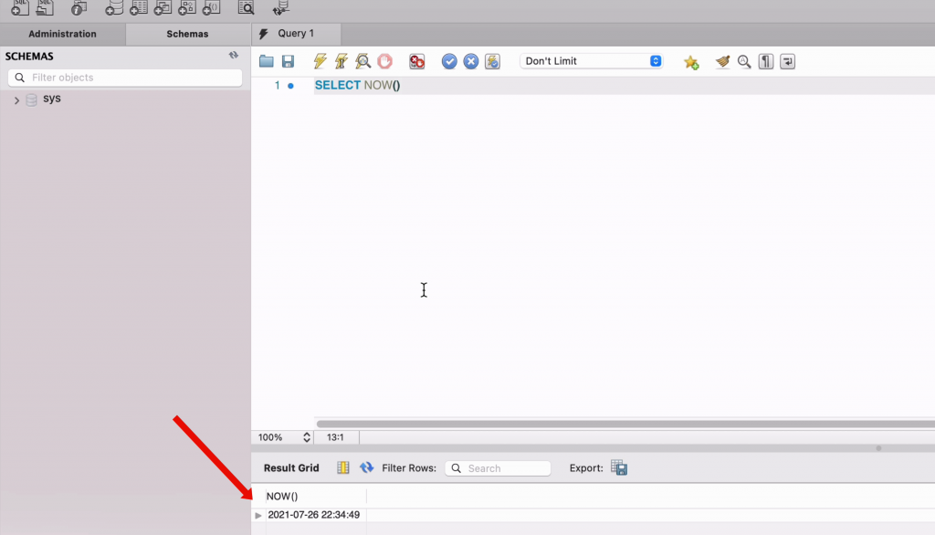 Step 6: Enter a simple query, such as SELECT NOW(), and run it. This should show the current date and time.