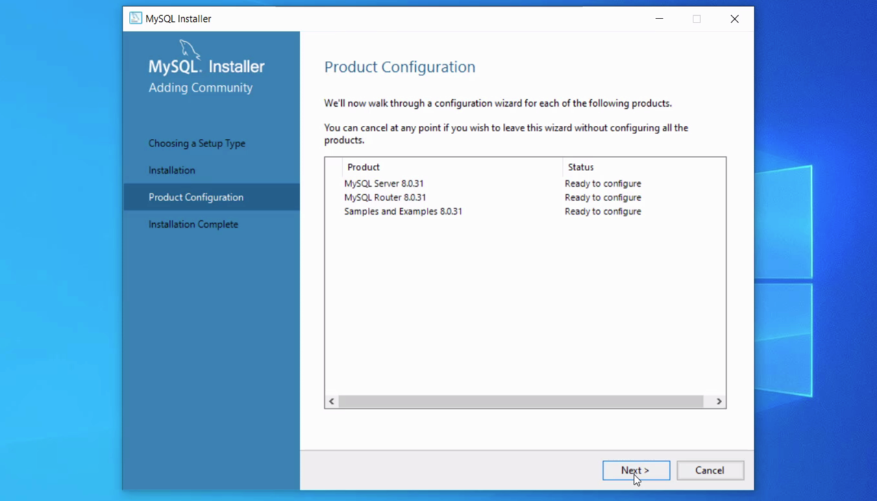 You’ll be taken back to the Product Configuration screen. The MySQL Server has been configured. Let’s proceed with the next two.