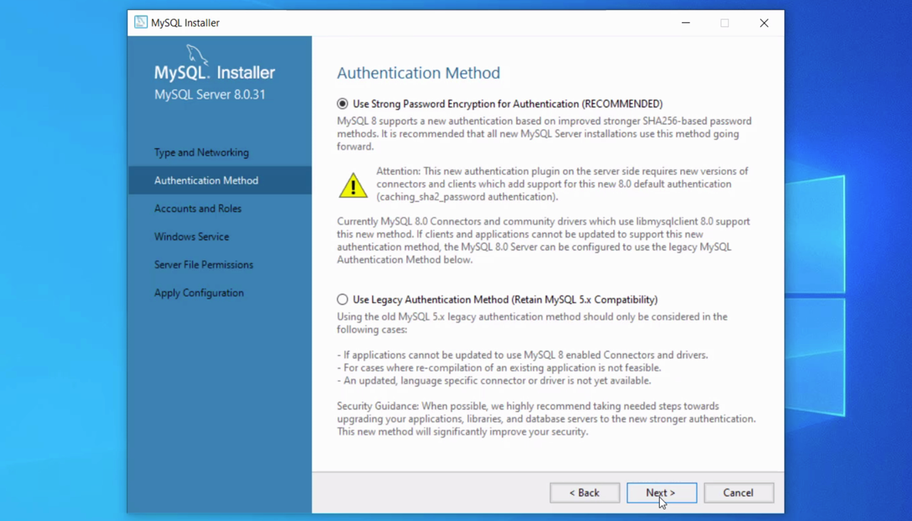 On the Authentication Method page, you can leave the default option of Use Strong Password Encryption. This is the recommended option. Click Next.