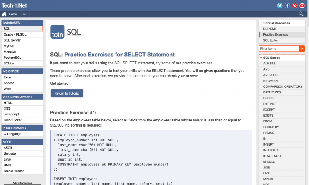 W3Schools is a website for learning a range of programming concepts including SQL. They offer an SQL practice feature using exercises, where you fill in the blanks to write queries.